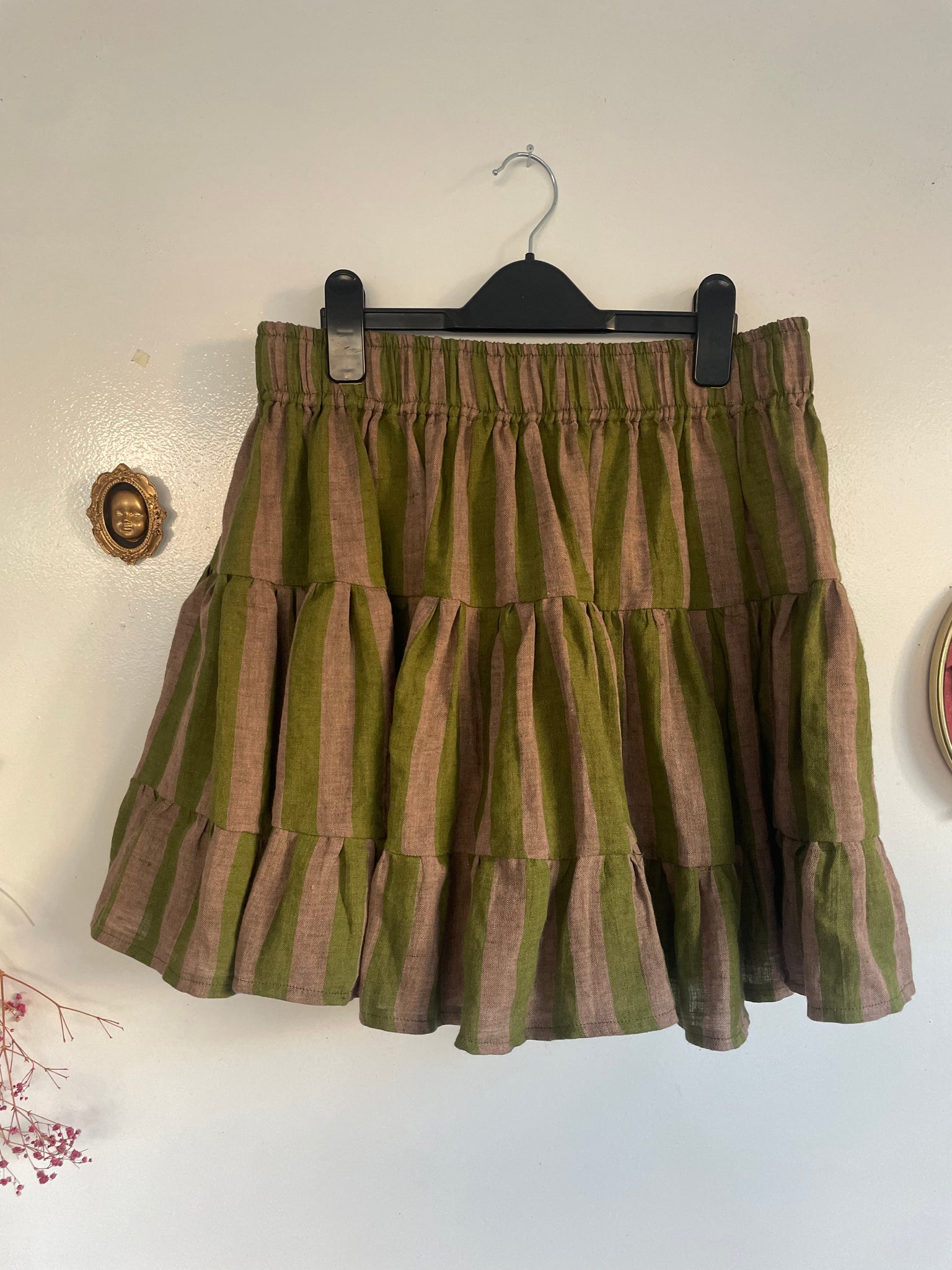 The original Ennis skirt was an instant bestseller so I had to bring it back in my favourite fabric. This is a dusty pink and green striped linen which has been ethically made from the seed to the final product.