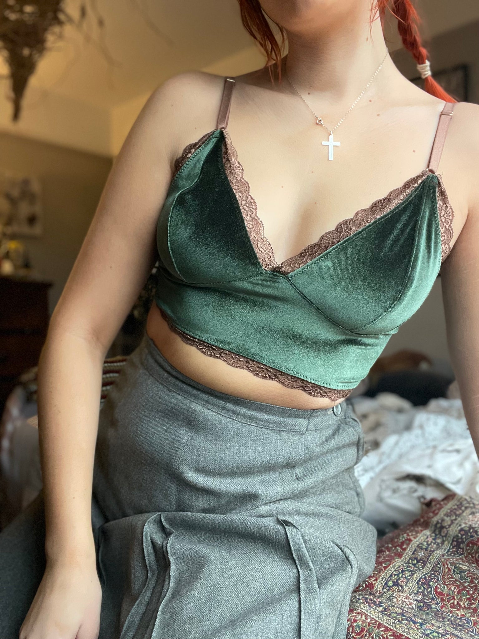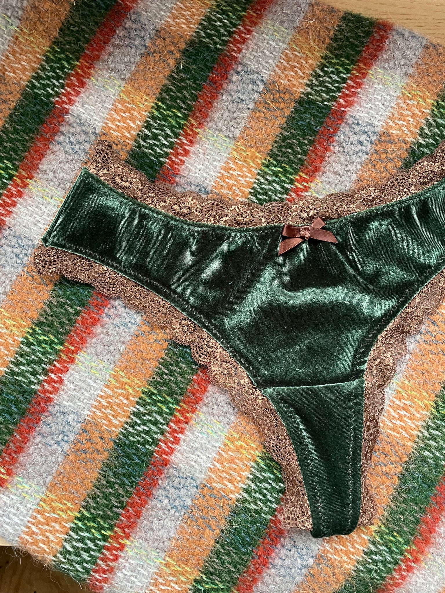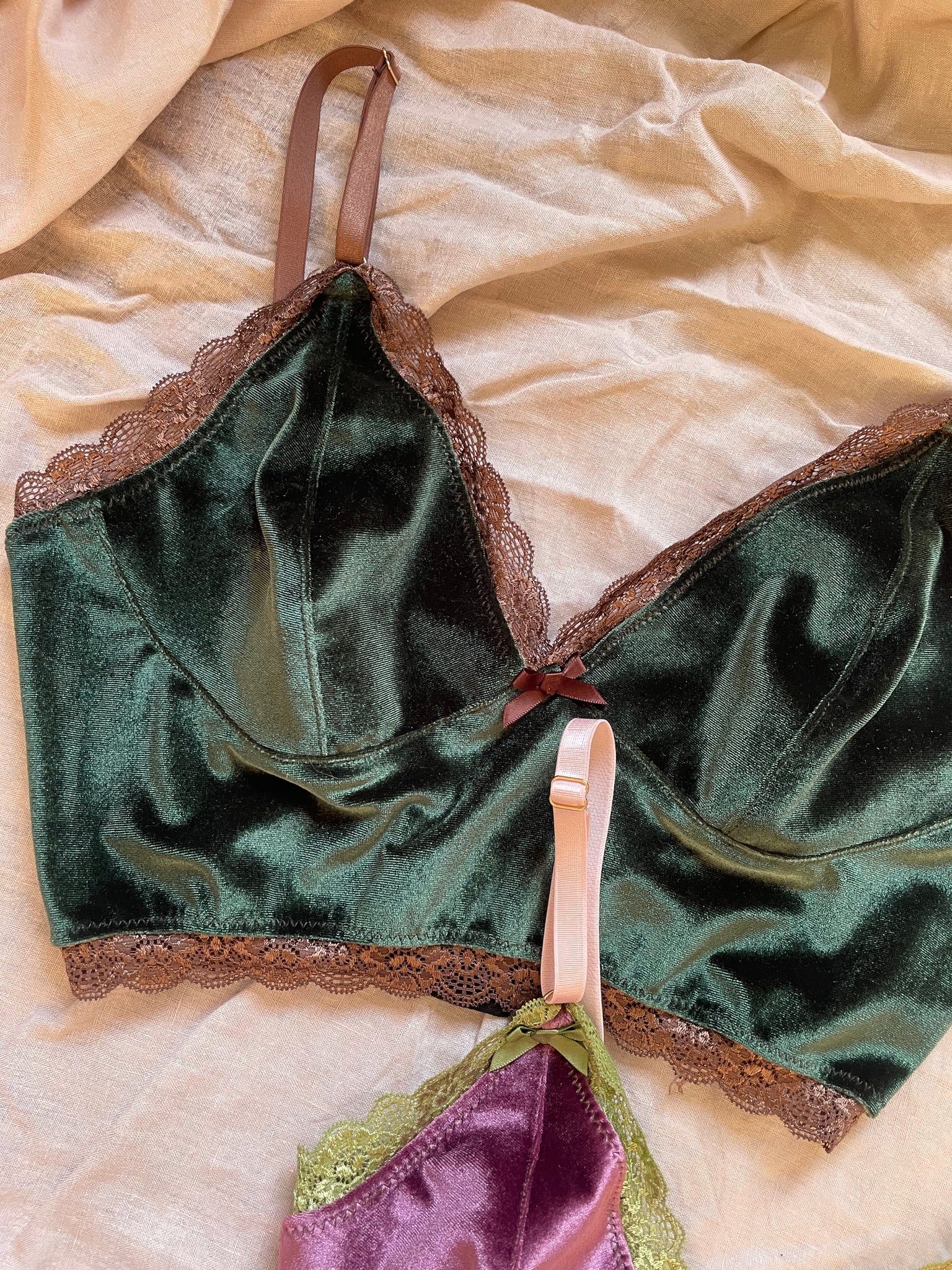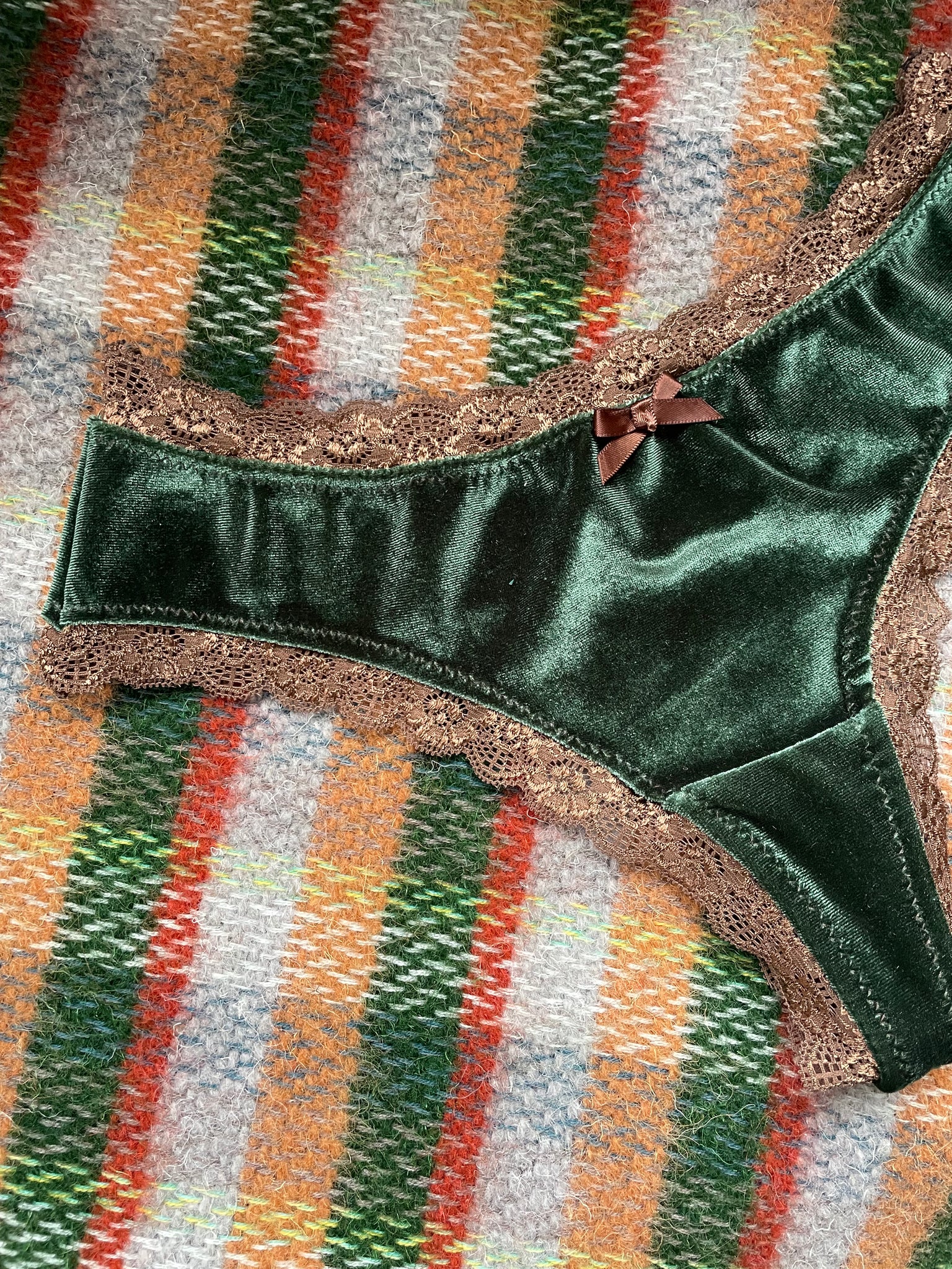 A Luxurious khaki green velvet with brown scalloped lace elastic, matching brown straps and hand finished with satin bow’s. This is a limited edition set as the fabric is a deadstock stretch poly mix.