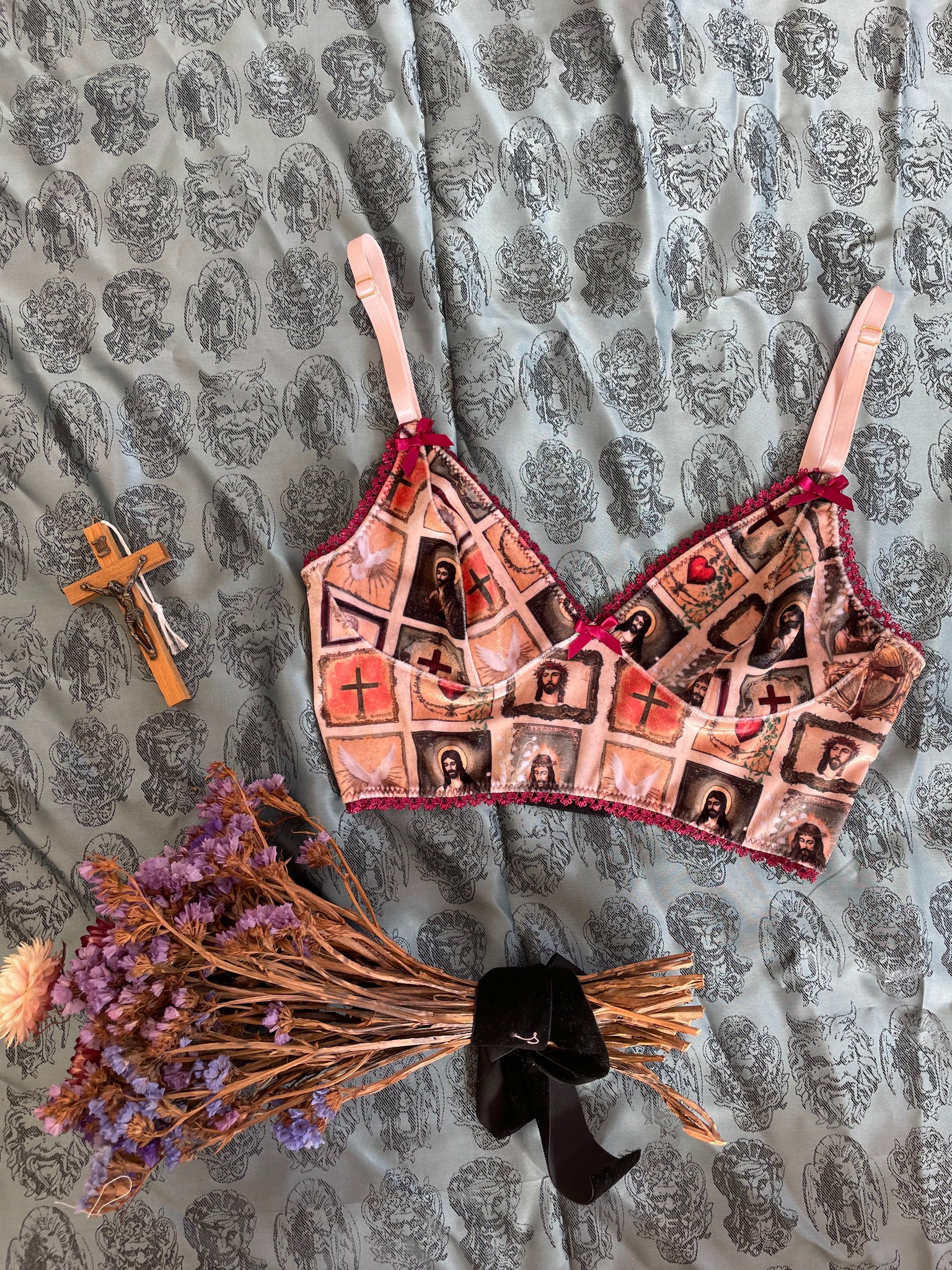 Inspired by the gothic resurgence in the 90s, the Rapture Bralette is a Jesus and Mary print, printed onto soft stretchy recycled polyester velvet. It’s a wicked little piece oozing with rebellion.