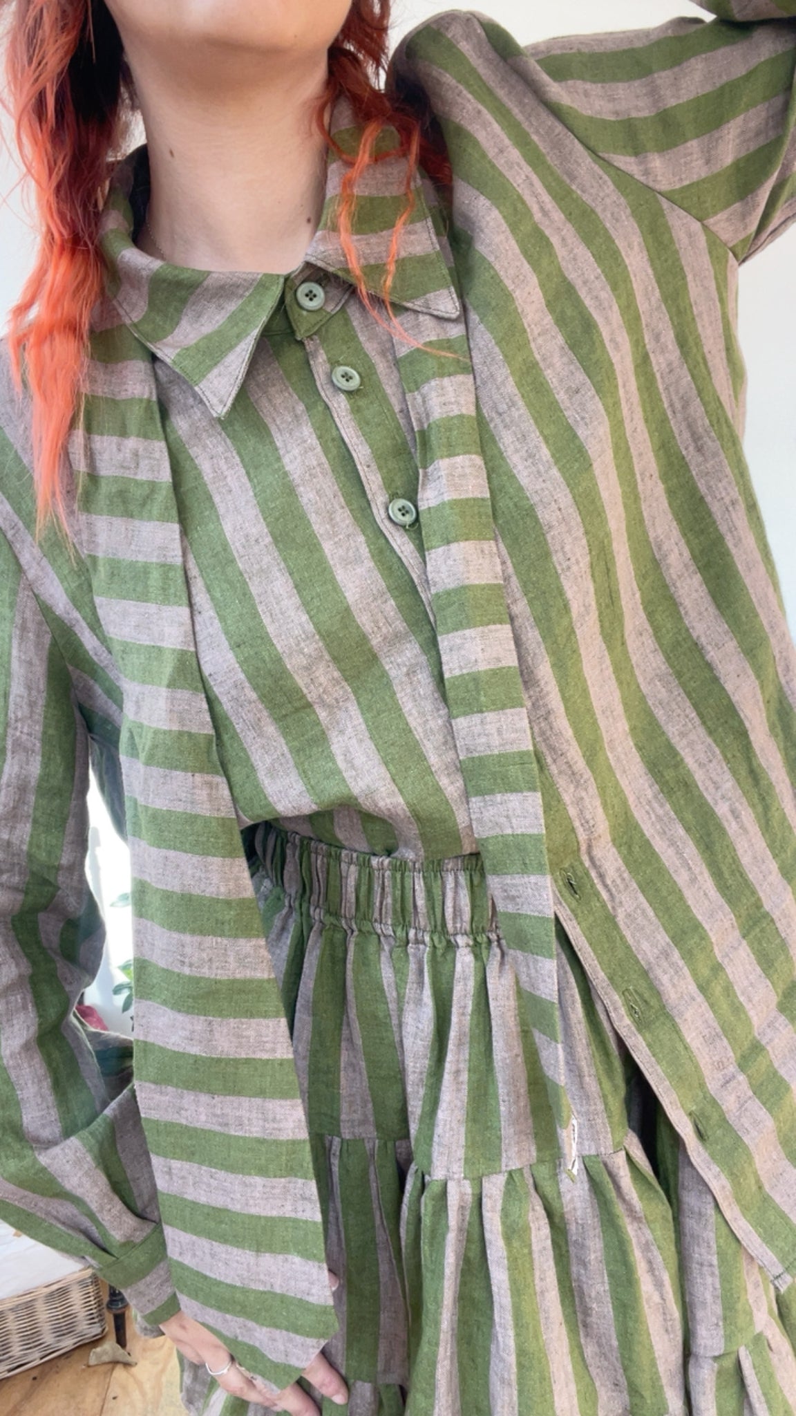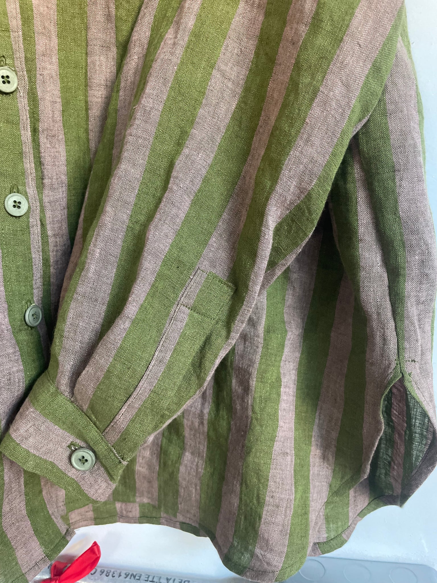 The Sable shirt is back in a full length classical shirt cut. This is a Unisex cut. Made from a beautiful moody green and pink striped linen that’s been ethical grown and sourced.