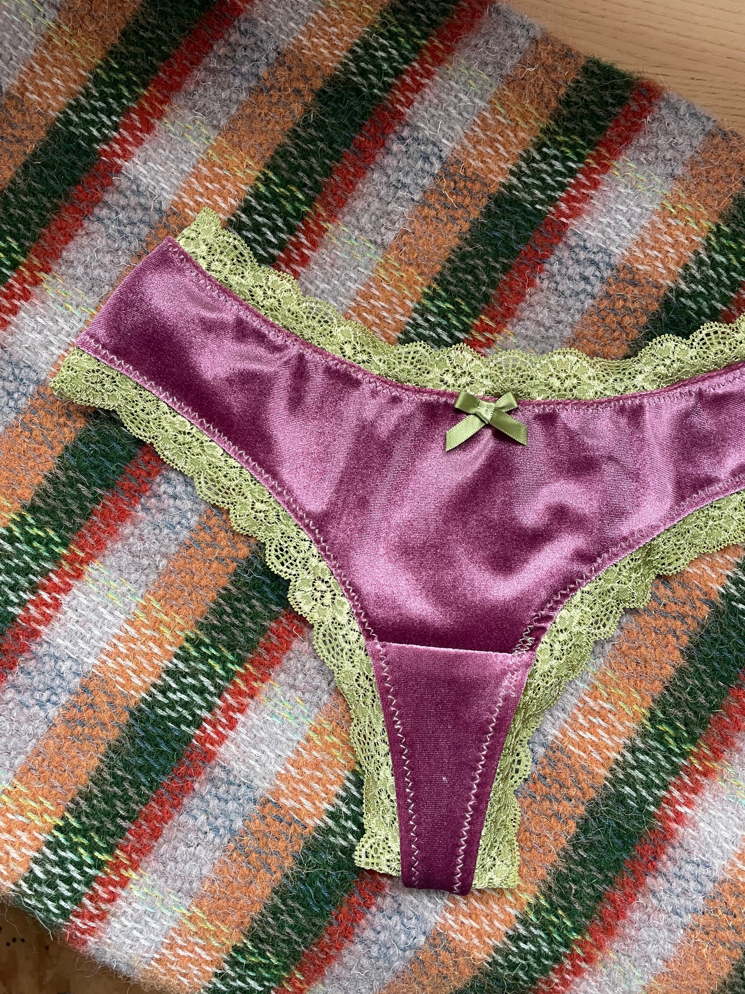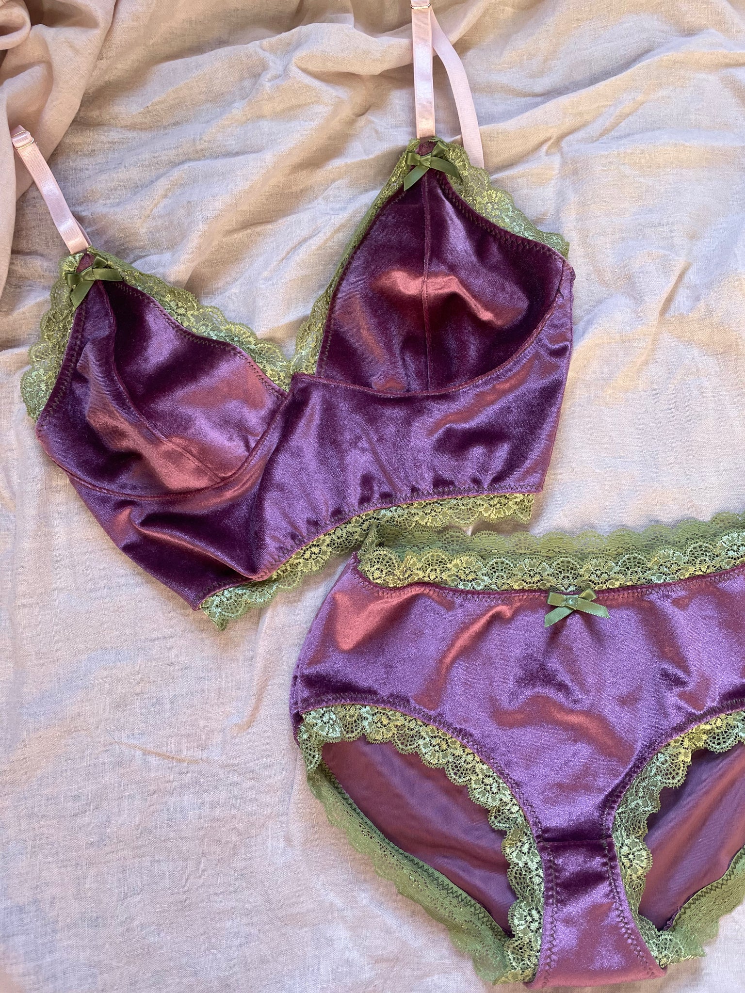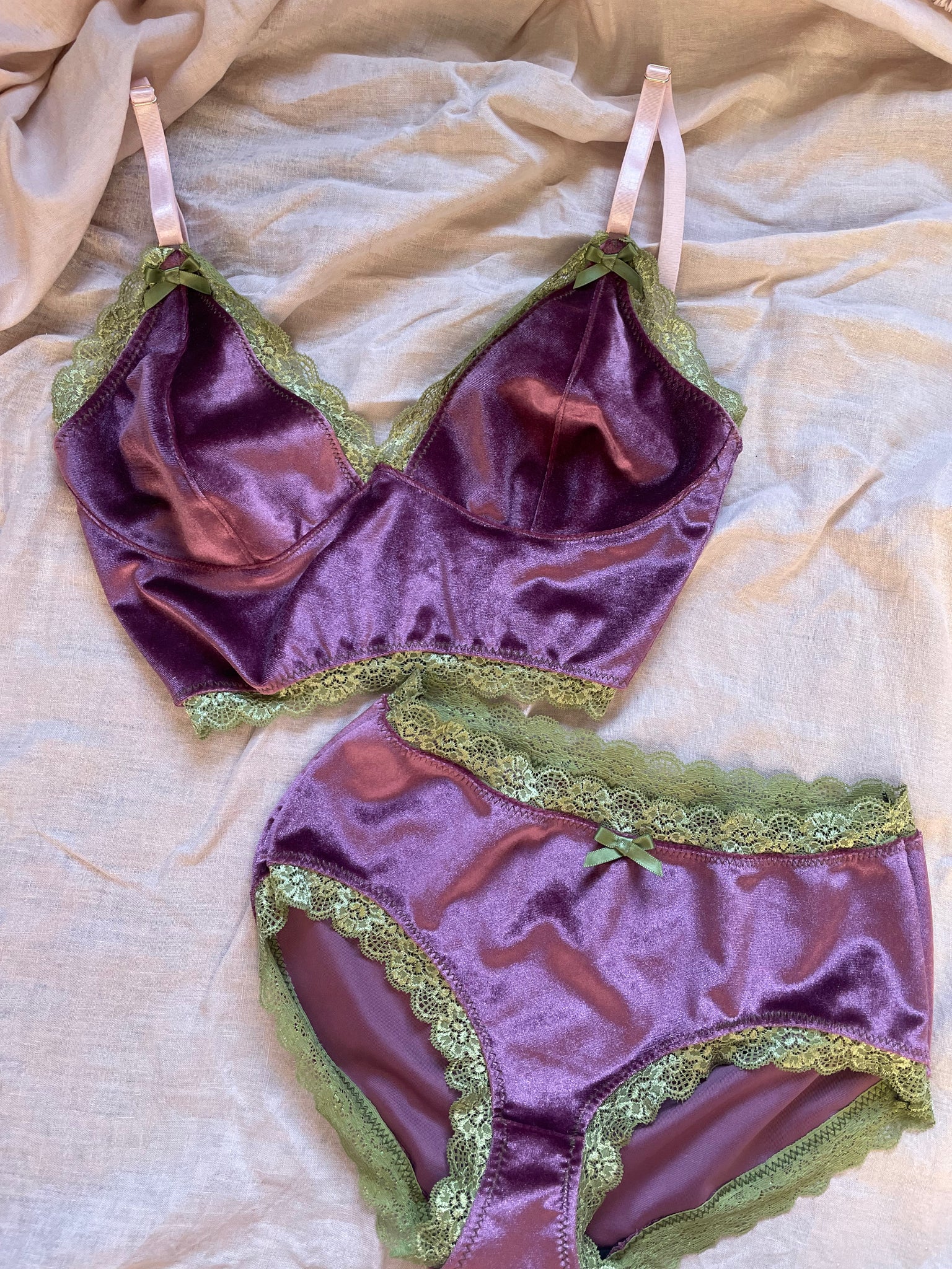 A really lovely mauve/pinky coloured velvet with contrasting khaki green scalloped lace elastic, sugar pink straps and hand finished with satin bow’s. This is a limited edition set as the fabric is a deadstock stretch poly mix.